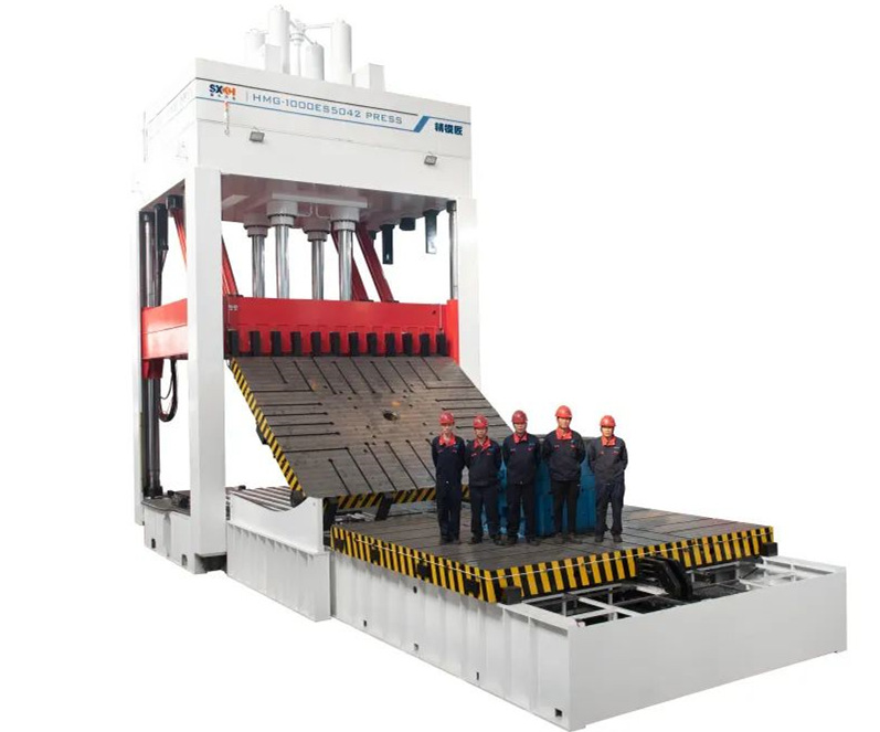 目前越來越多的車企正在研發(fā)、投入一體化壓鑄成型技術(shù),隨之而來的壓鑄模具的噸位也越來越大,有些模具重量甚至接近200噸。在6000T壓鑄機(jī)未面世之前,合模機(jī)最大噸位為600噸(合模力),工作臺面尺寸小于4200mm×3500mm,適用于5000T以下壓鑄島。在此背景下,傳統(tǒng)的配模試驗(yàn)機(jī)已無法滿足一體化壓鑄模具的配模條件,因此順興開浩公司于2020年著手研發(fā)超大型配模設(shè)備,先后開發(fā)出合模力800噸、1000噸超大型合模機(jī)。